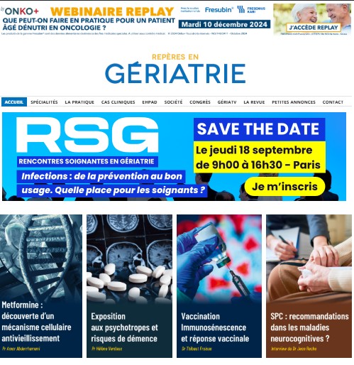 - Repères en Gériatrie est une revue mensuelle, disponible en ligne et en papier, destinée aux professionnels de la gériatrie, qu'ils exercent en milieu hospitalier, libéral ou mixte.